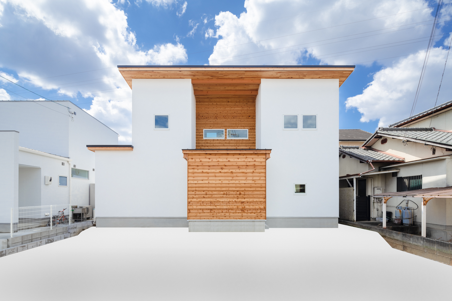 青空に映える「白×木」のコントラスト。シンプルモダンな外観デザイン