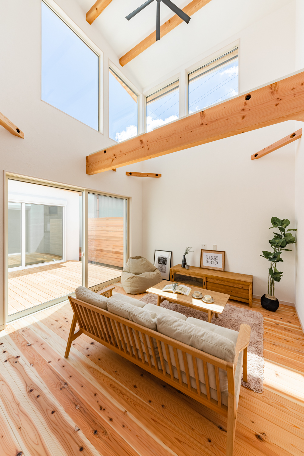 窓を開け放てば、リビングとデッキがひとつの大空間として繋がり、まるで部屋が外まで拡張されたかのような感覚になります。