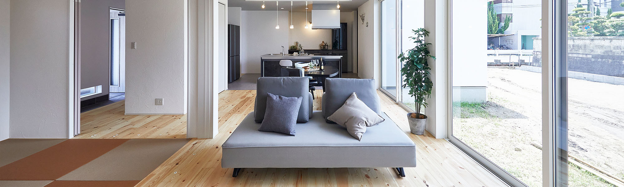 リビングを中心にした平屋は、勾配天井の伸びやかさと、南面の大きな掃き出し窓から広がる庭の開放感が心地よい住まいです。