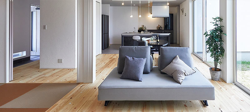 内装は無垢の床に漆喰や自然クロスを組み合わせ、温もりと落ち着きを感じられる空間に。